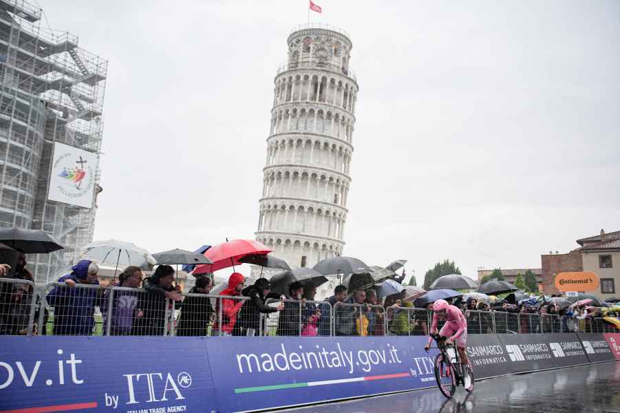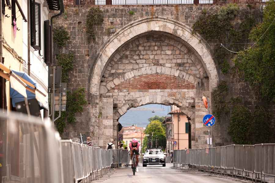 La Corsa poi fa i suoi giochi e il giovane Olandese Daan Hoole della Lidl Trek dall’alto dei suoi 1,98 cm vince a mani basse una cronometro individuale che nel tragitto dalle Mura di Lucca, ove è posta la partenza, a quelle di Pisa passa per 28,6 Km di splendore fatto natura, storia, cultura, arte: dopo aver percorso il giro quasi completo delle mura cittadine, si raggiunge la statale del Brennero e con un tratto praticamente diritto in lievissima ascesa si attraversa il famoso ‘Foro’ (la galleria dei Monti Pisani a 950 m). Poi si costeggia l’acquedotto romano nel comune di San Giuliano Terme, bellissimo esempio di arte urbana, e sempre per vie rettilinee si raggiunge l’abitato di Pisa con i lungarni in festa che ormai ci hanno preso gusto a gioire, sino e approdare nel cuore della città, in Piazza dei Miracoli. Ancora una festa, ancora a Pisa, dopo quella recente per la promozione della squadra di calcio in ‘serie A’ dopo 34 anni, oggi si festeggiano le due ruote che tornano qui con la Corsa Rosa dopo 45 anni. Un arrivo di cronometro fortemente voluto dall’amministrazione cittadina, per stessa ammissione in tv pochi giorni fa, dell’assessore allo Sport di Pisa, Frida Scarpa, per dare ulteriore visibilità a un luogo che forse non ne ha neppure bisogno ma con la convinzione che la Corsa Rosa rappresenta comunque un volano per economia locale e turismo.