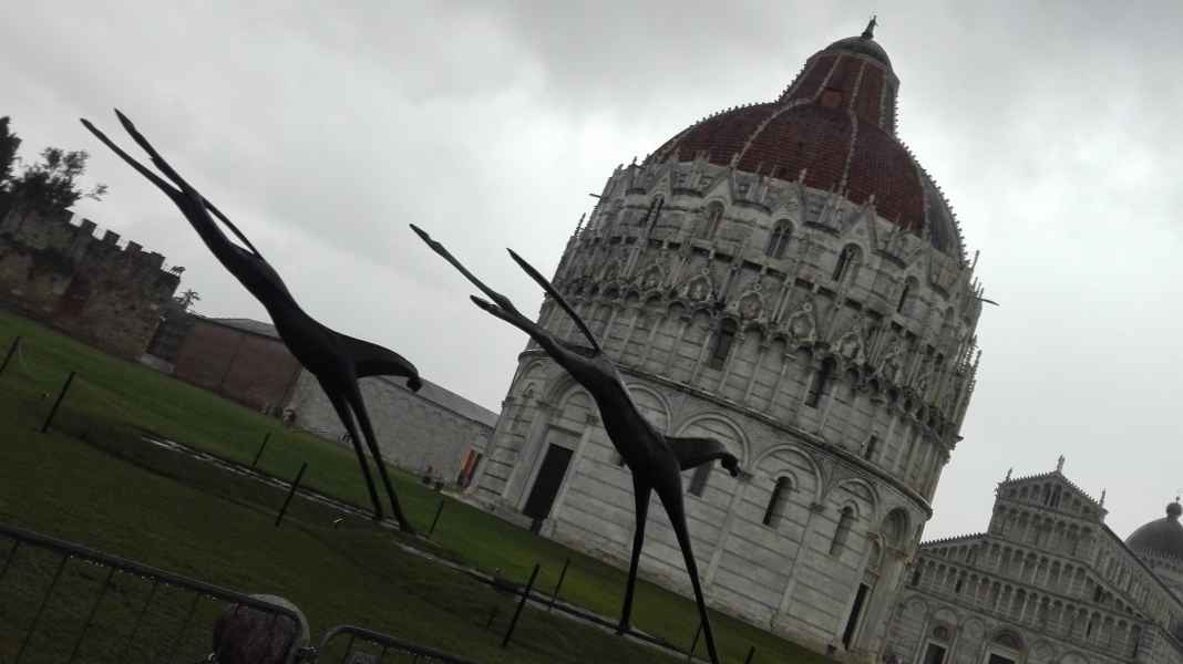 Tra la carovana dei turisti in fila per rimirare un angolo di terra benedetto da cotanta bellezza artistica e quella Rosa, si fanno spazio giovani danzatrici sulle Mura, con Arcturus e Sun, i due cavalli bronzei, di Antonio Signorini che si stagliano poderosi sul prato dei Miracoli contro il Battistero e quella che, sullo sfondo, è il simbolo di Pisa nel mondo, la Torre Pendente.