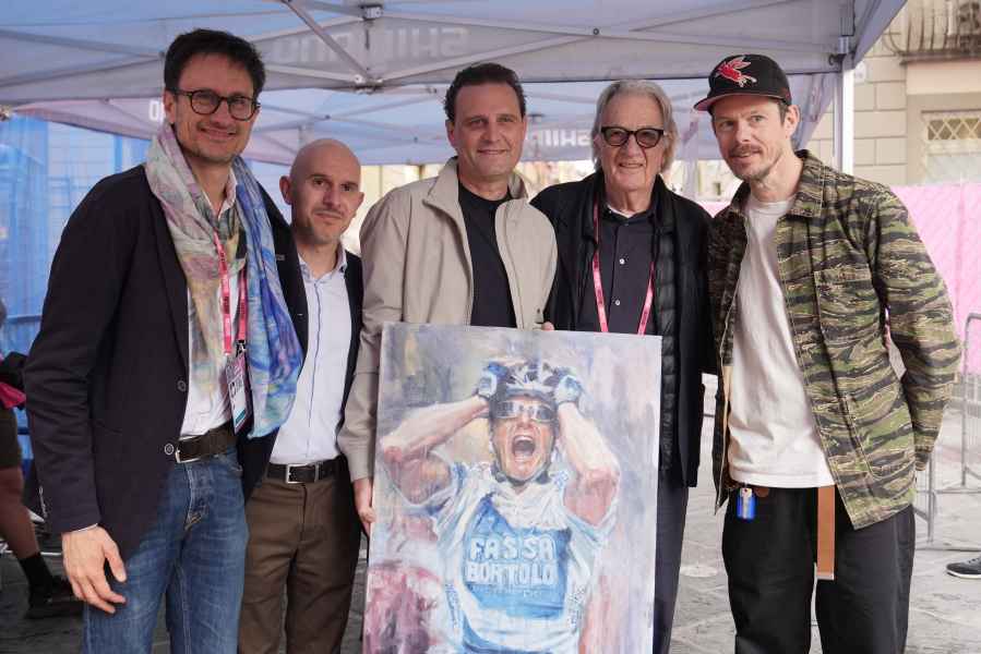 Partenza della cronometro individuale della tappa 10 dal centro storico di Lucca ove un emozionato Alessandro Petacchi ha ricevuto in omaggio dall’artista Karl Kopinski, illustratore di fama mondiale, un ritratto speciale del ciclista del quale è grande amico.