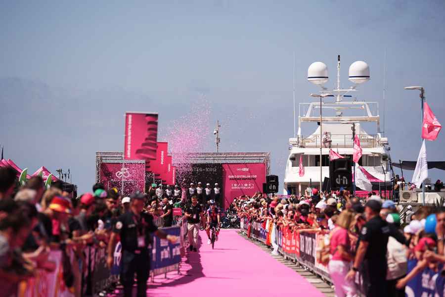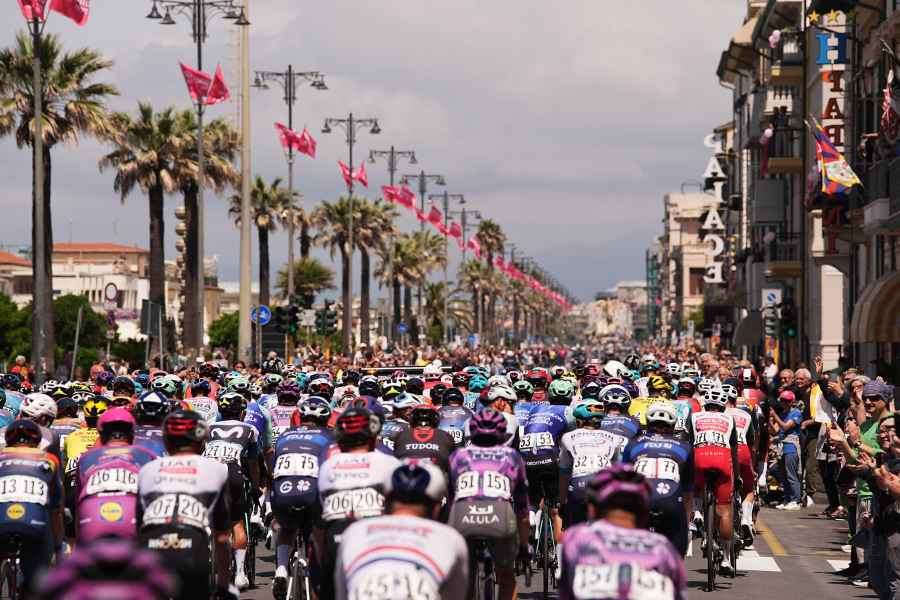 Dopo la pioggia torrenziale della cronometro individuale di Pisa, una bella giornata di Sole accoglie ciclisti e appassionati alla partenza della tappa numero 11 della Corsa Rosa dalla Darsena di Viareggio (LU), cuore pulsante ed economico di questa città fatta di cartapesta e sogni, di megayacht e lusso estremo, di salsedine e buon cibo.